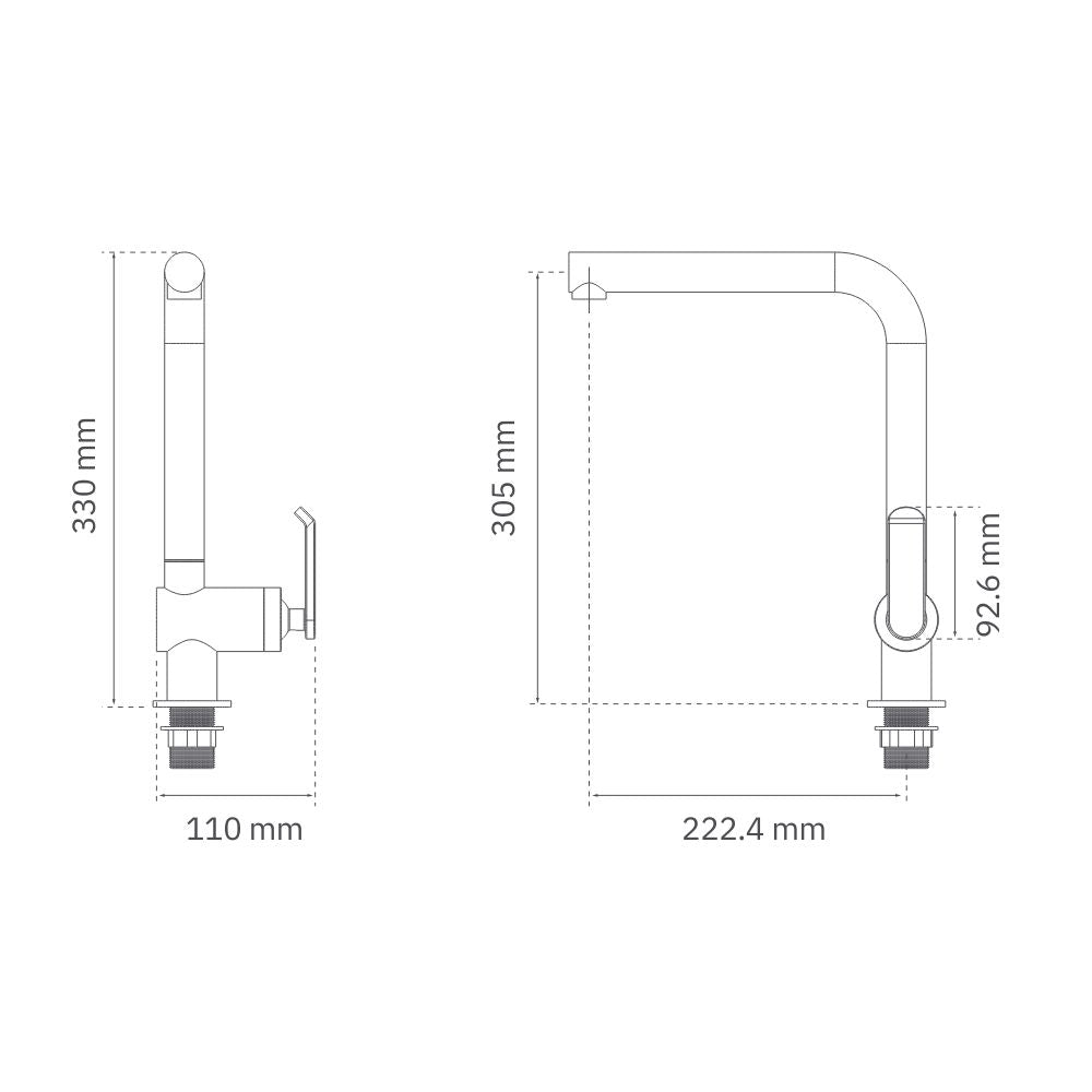 Cuerpo y manijas metálicas - Altura de 39 cms - Instalación de un solo hueco - Brazo giratorio 360º - Incluye conectores